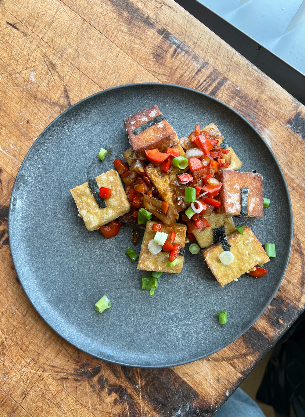 - Cut tofu into 1 cm squares and then press your nori strips onto your tofu