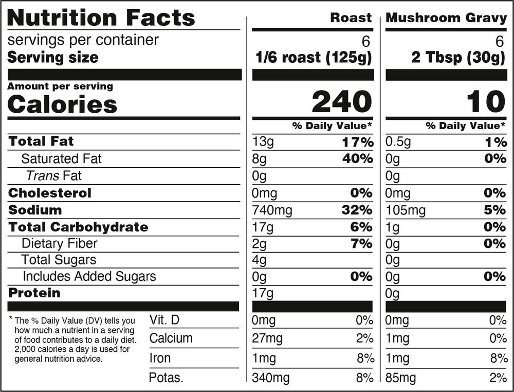 The roast must be cooked before serving. Remove the roast from the plastic packaging and place on a parchment lined baking pan. Bake at 350ºF (175ºC) for 45-50 minutes until the internal temperature reaches 165ºF (75ºC) on an instant read thermometer. For the best taste experience, serve immediately while hot with the Big Mountain Gravy. To heat the gravy, open the gravy package and transfer the contents to a small pot. Heat over low heat, stirring frequently, until the gravy comes to a boil. Thin out with water if desired.